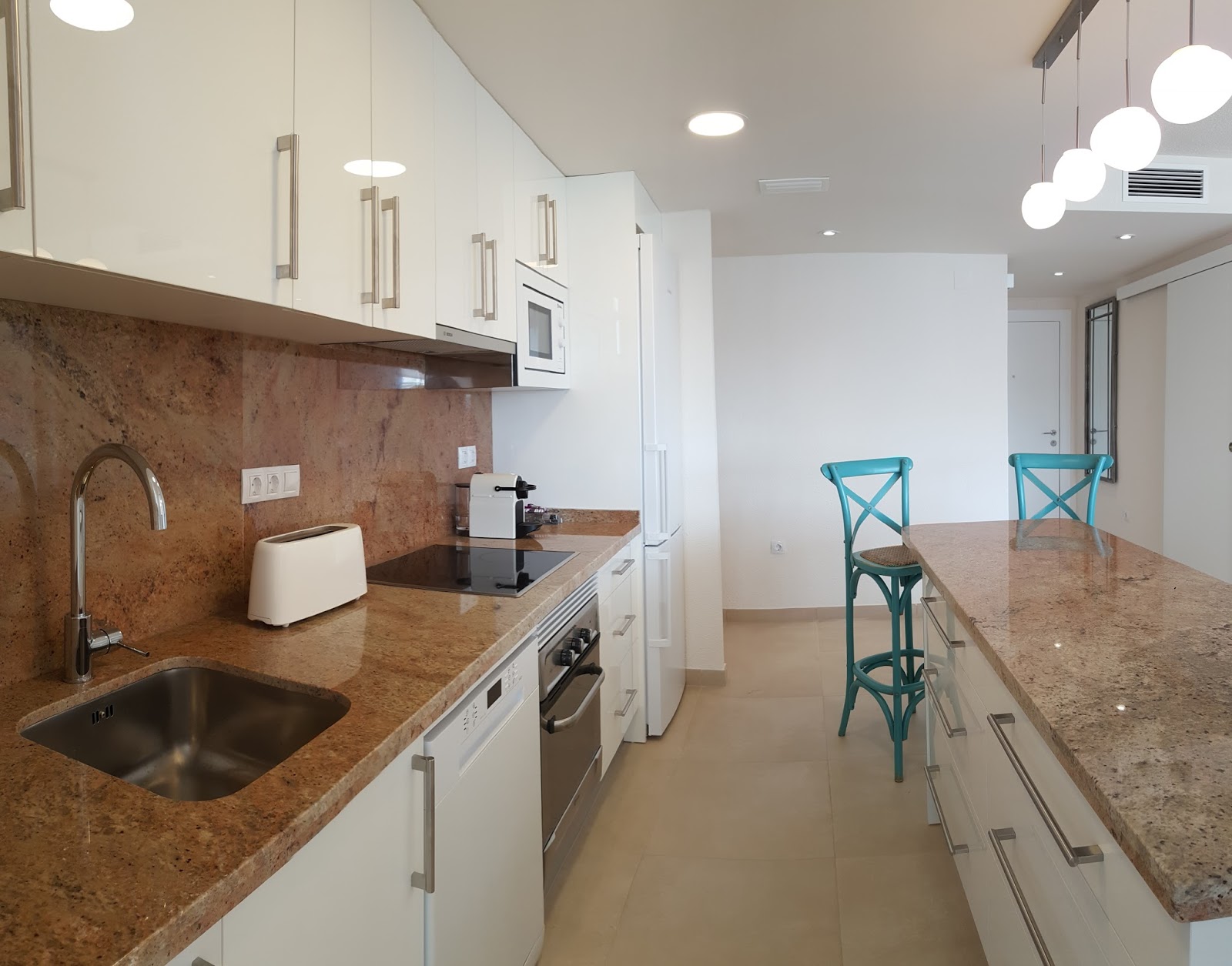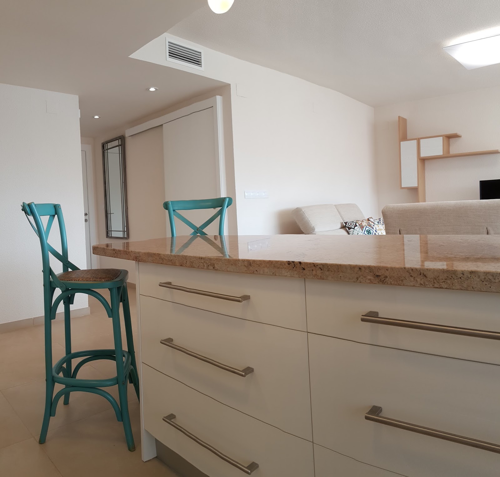 Nuestro trabajo inicial consistió en integrar al salón la cocina, el pasillo y la terraza, consiguiendo así un espacio amplio y luminoso.