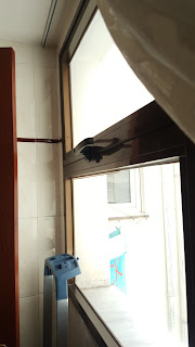 La pequeña ducha del aseo del pasillo se eliminó y en su lugar se ubicó un armario de limpieza con la lavadora, facilitando su uso y el tendido de la ropa por la ventana contigua.