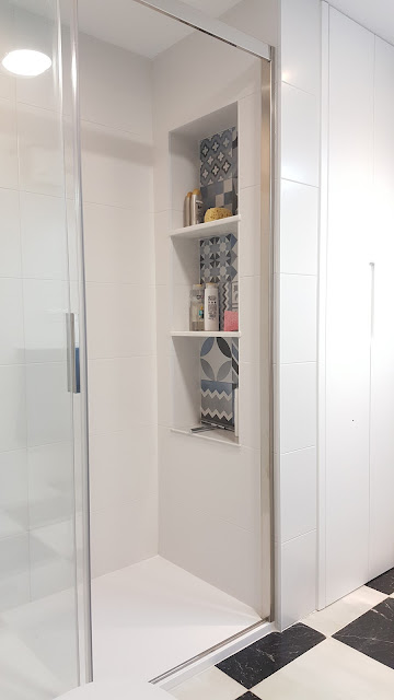 El cambio del baño principal ha sido espectacular. La eliminación del bidé nos permitió cambiar la situación de la zona de ducha, añadiendo un armario de obra y permitiendo una zona para el lavabo mucho mayor y despejada. Los azulejos imitación al hidráulico antiguo le dan personalidad al baño, no necesitando más que un azulejo blanco de gran formato para el resto de paredes.